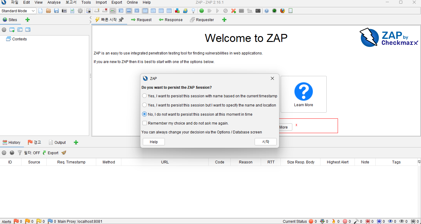 → 저장하지 않음(메모리상으로만 유지). ZAP 종료하면 작업 내역이 사라집니다. - Remember my choice and do not ask me again (체크박스)