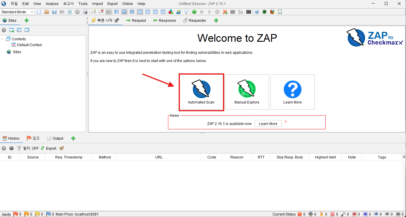 - 클릭하면 ZAP이 Spider → (설정에 따라) Active Scan을 순차적으로 실행.