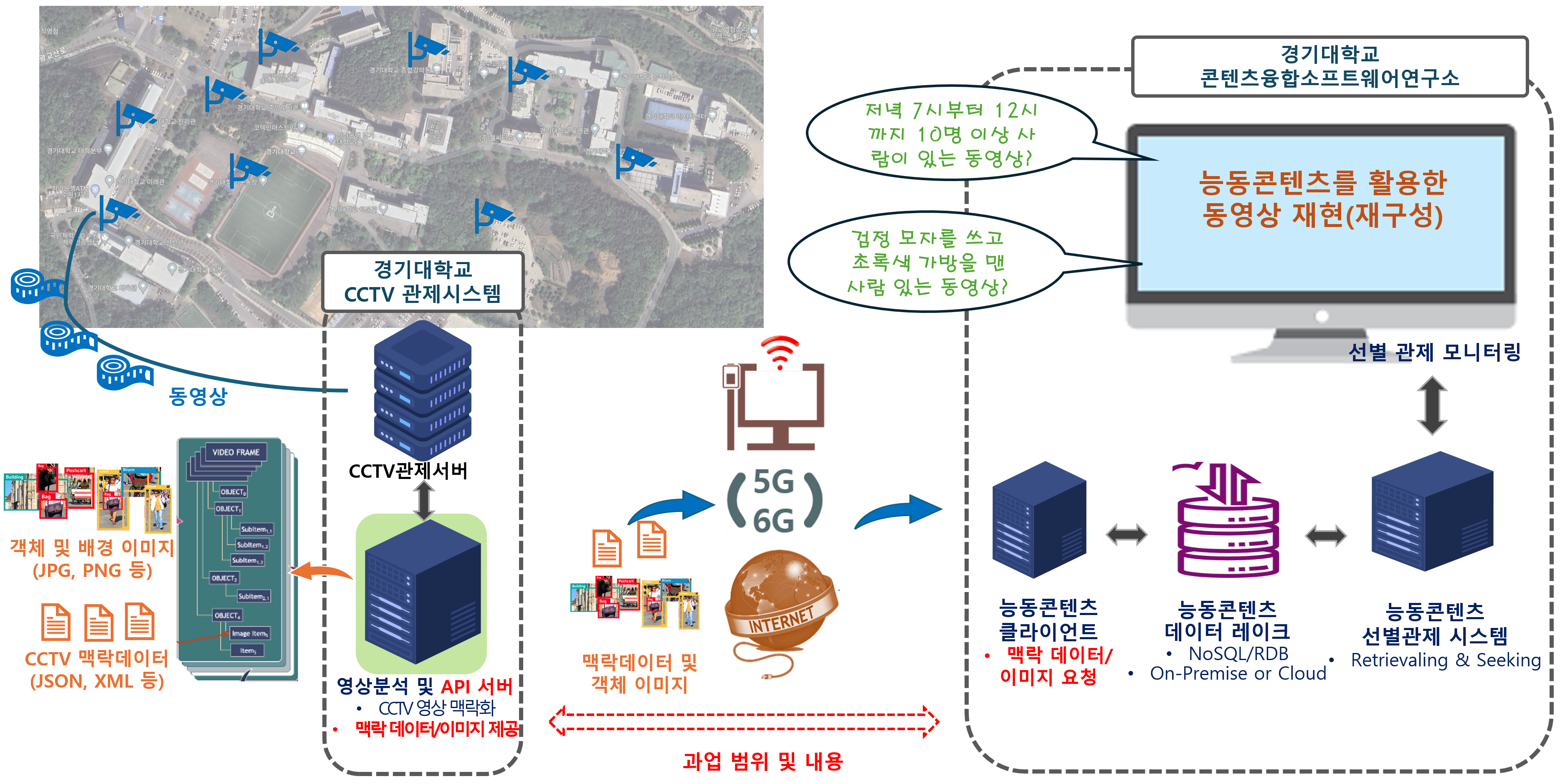 CCTV 맥락 데이터 수집 및 관리를 위한 API 서버 및 클라이언트를 연구개발하며, 최종적으로 경기대학교 통합관제실과 콘텐츠융합소프트웨어연구소에 API 서버 및 클라이언트를 각각 구축한 뒤 데이터 연동 테스트를 수행